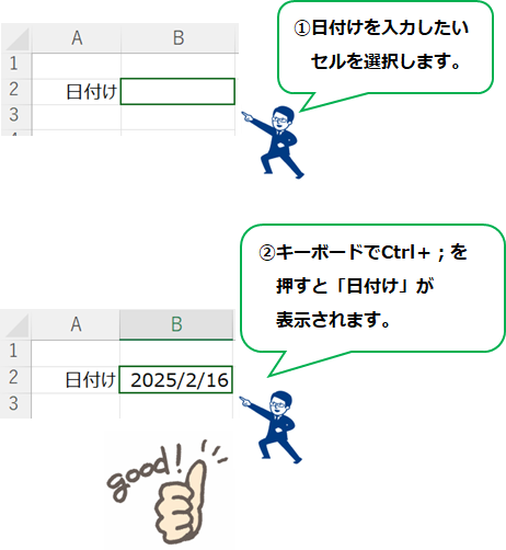 ■ 日付けを入力したいセルを選択し、キーボードで「Ctrl」 +「;」を押します。