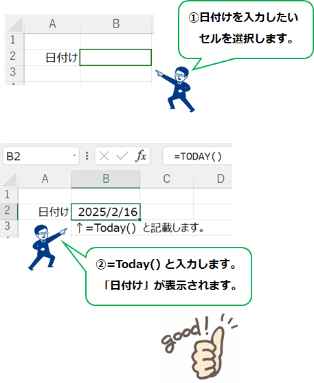 ■ 日付けを入力したいセルを選択し、=Today()と入力します。