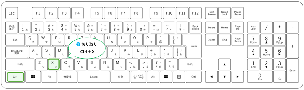 1⃣ 切り取りたいセルにカーソルを合わせて「Ctrl」+「X」で切り取り。