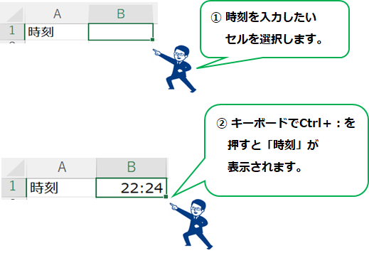 時刻を簡単入力 2024 10/13 EXCEL投稿一覧 ■ 時刻を簡単に入力する キーボードから「Ctrl」+ 「:」を押す ■ 時刻を入力したいセルを選択し「Ctrl」+「:」を押す(時間は自動更新されない) EXCEL投稿一覧