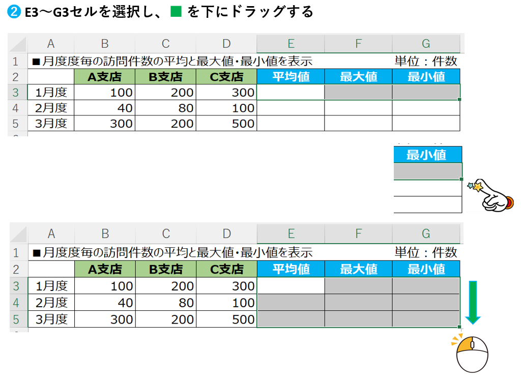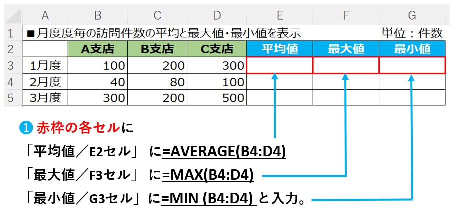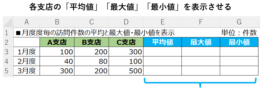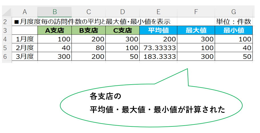 例) 各支店/月度毎の訪問件数の平均値・最大値・最小値を計算する。