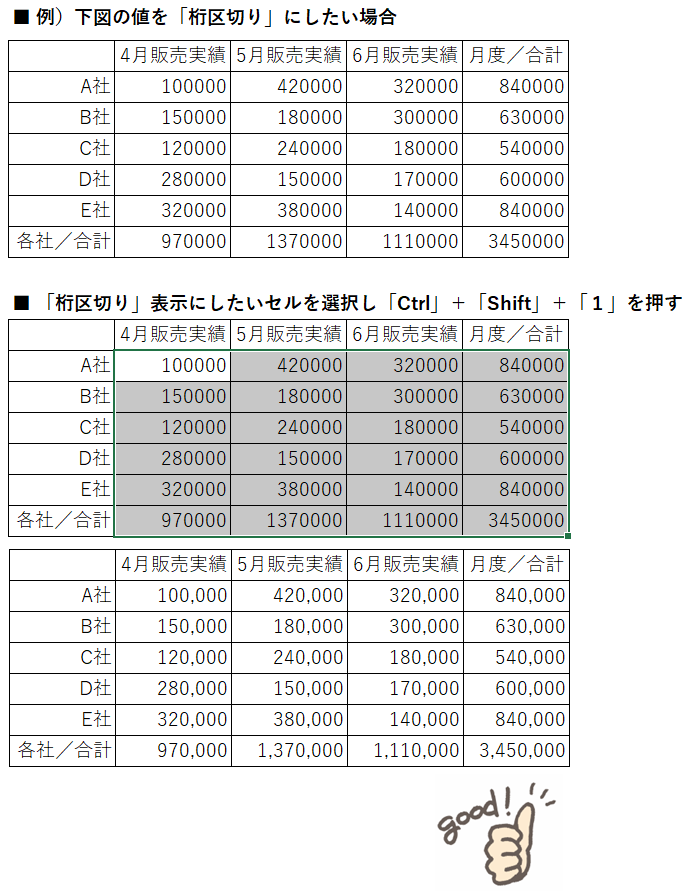 桁区切り表示にする 2025 1/12 未分類 ■ 「桁区切り」表示にする 「桁区切り」表示にしたいセルを選択し「Ctrl」+「Shift」+「1」を押す ■「桁区切り」」にしたいセルを選択し「Ctrl」+「Shift」+「1」を押す ※「Ctrl」+「Shift」+「^」で元の標準形式に戻ります。 未分類