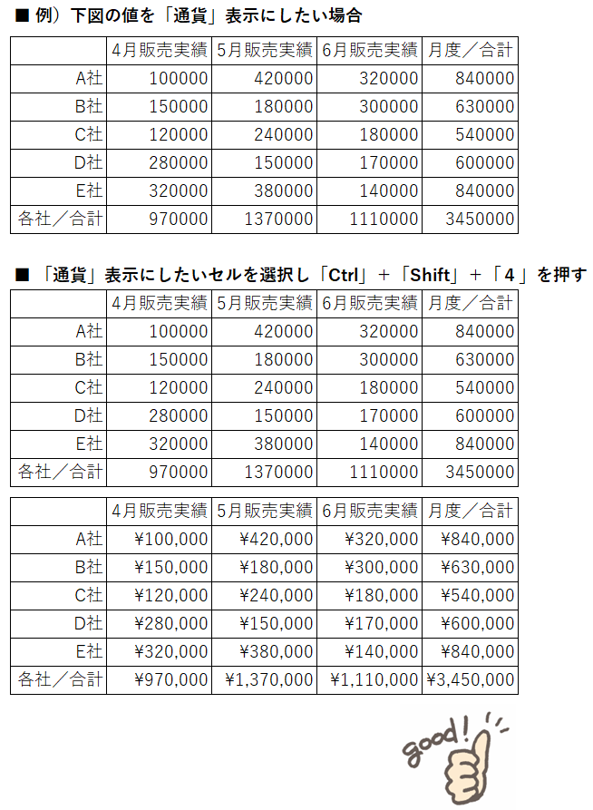 通貨表示にする 2025 1/12 EXCEL投稿一覧 ■ 「通貨」表示にする 「通貨」表示にしたいセルを選択し「Ctrl」+「Shift」+「4」を押す ■ 「通貨」表示にしたいセルを選択し「Ctrl」+「Shift」+「4」を押す ※「Ctrl」+「Shift」+「^」で元の標準形式に戻ります。 EXCEL投稿一覧