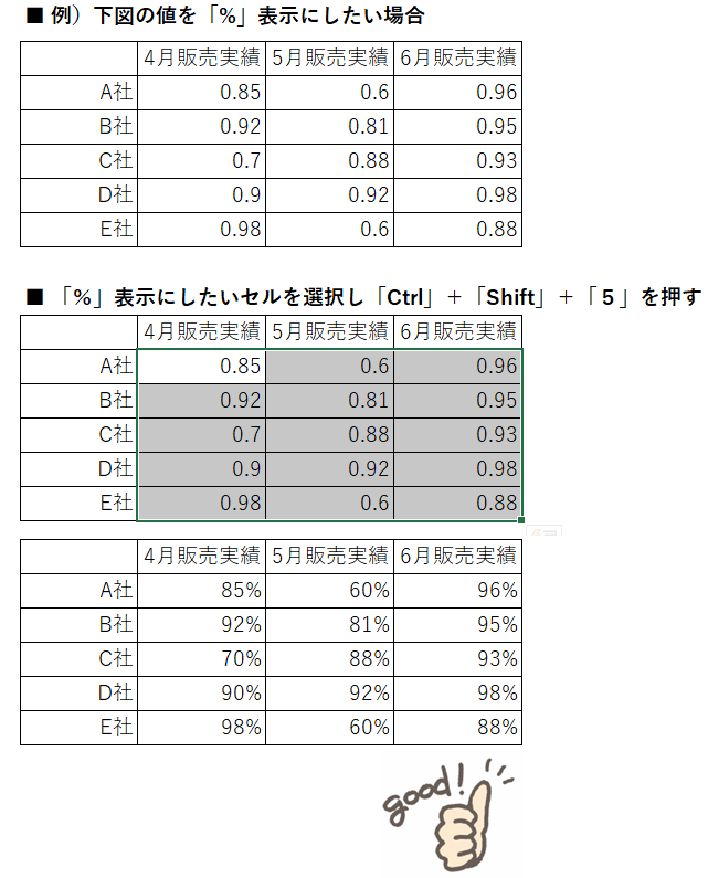 ■ 「%」表示にしたいセルを選択し「Ctrl」+「Shift」+「5」を押す