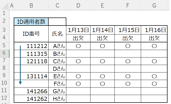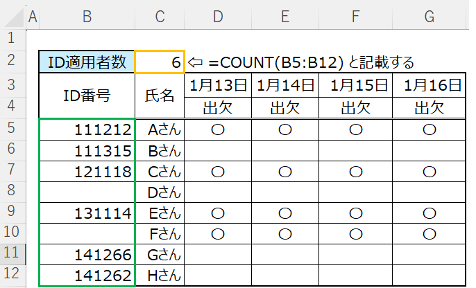 表示させたいセルに「 =COUNT(B5:B12) 」と記載する