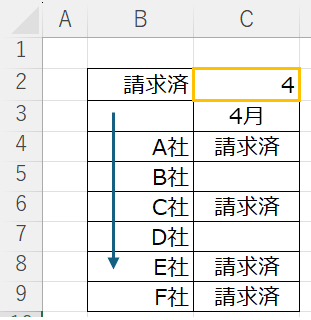 文字が含まれるセルを数える 2025 1/18 未分類 ■ 文字が含まれるセルを数える COUNTIF 関数を使う ■ 下記表から「請求済」の数を数える ■ 数をカウントしたいセルに「=COUNTIF(D4:D9,”*”)と記載する ”*” は全てのテキスト(文字)をカウントします。 未分類