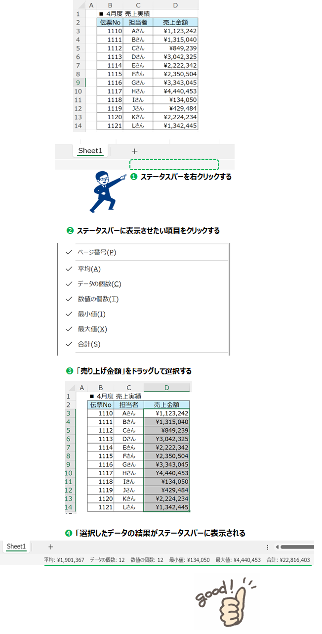 ステータスバーで合計・平均などを確認 2025 1/22 EXCEL投稿一覧 ■ ステータスバーで合計・平均などを確認する ステータスバーの設定を変更する ■ 下記データの「売り上げ金額」の 「合計」・「平均」・「最小値」・「最大値」・「合計」を表示させる EXCEL投稿一覧