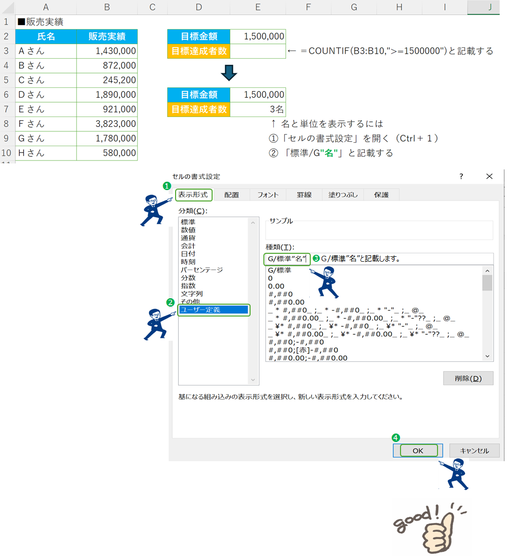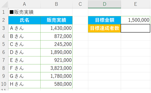 ■条件を満たすセルの個数を数える 2025 1/27 EXCEL投稿一覧 ■ 条件を満たすセルの個数を数える COUNTIF関数を使う ■ 下記表から目標金額\1,500,000を達成した人数を表示します。 ■ 人数を表示させたいセルに =COUNTIF(B3:B10,”>=1500000″) と記載します。 EXCEL投稿一覧