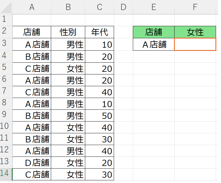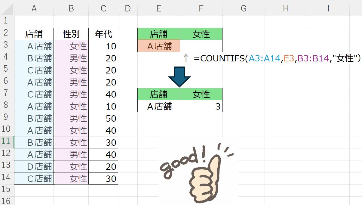 複数の条件を満たすセルの個数を数える 2025 1/29 EXCEL投稿一覧 ■ 複数の条件を満たすセルの個数を数える COUNTIFS関数を使う ■ 例)下記の表から「A店舗」に男性が入店した回数を数える ■ 表示したいセルに =COUNTIFS(A3:A14,E3,B3:B14,”女性”) と入力する。 EXCEL投稿一覧